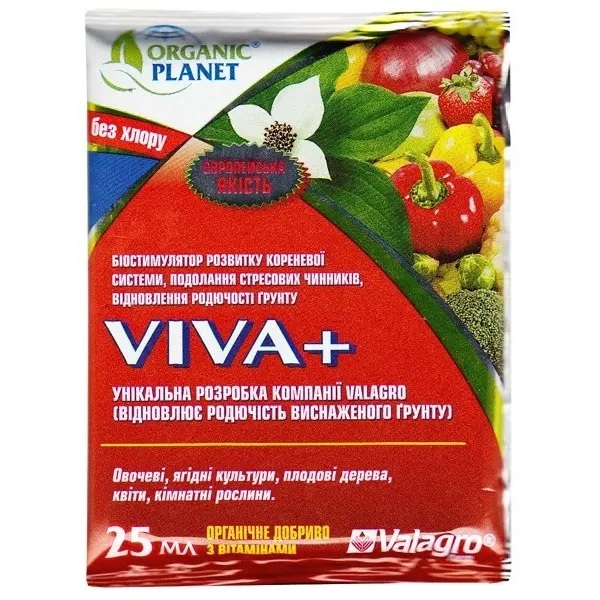 Viva plus - стимулятор развития корневой системы, преодоления стрессов, восстановления плодородия почв, роста и увеличения урожайности. Комплексно действует как на корневую систему, так и на наземную часть. При внесении в прикорневую зону вместе с поливом, создает подходящую среду для развития корневой системы и полезной микрофлоры почвы, давая мощный толчок процессам роста. В составе препарата особые органические вещества, аминокислоты, протеины, пептиды, полисахариды, гуминовые кислоты, комплекс витаминов (В1, В :, РР), фолиевая кислота, иноситол.