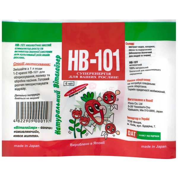 Органический стимулятор роста Нв 101 предназначен для культивации всех видов культур овощного и плодово-ягодного типа и позволяет значительно сократить применение химических удобрений.Данный стимулятор роста содержит в составе экстракт кедра, кипариса, сосны и подорожника – смесь натуральных вытяжек, полученных из тех частей растения, которые отвечают за рост, развитие, цветение и плодоношение.Препарат снижает содержание нитратов в плодах, повышает устойчивость растений к неблагоприятным условиям окружающей среды, фитофторозу и кислотным осадкам.Биостимулятор существенно повышает питательную ценность листьев и плодов и способствует приросту общей урожайности.Чтобы достичь желаемого эффекта при поливе смесью нужно соблюдать регулярность опрыскивания или полива – 1 раз в неделю. Экологический стимулятор НВ-101 успешно используется для подкормки вишни, черешни, лука, чеснока, капусты, огурцов, перца, арбуза, дыни, роз, рапса, гороха, редиса, сельдерея, баклажанов, свеклы, ячменя, сливы, груши. , томатов, яблони, винограда, земляники, крыжовника, персика.