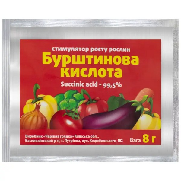 Препарат янтарная кислота (Succinic acid) предназначен для обработки растений, полива почвы и замачивания семян для активизации процессов роста и развития, улучшения всхожести и повышения урожайности культур. Янтарная кислота является органическим соединением, синтезируемым растениями естественным способом.Подкормка любой рассады янтарной кислотой – это действенный способ укрепить ее иммунитет и ускорить рост. Обработка семян раствором янтарной кислоты перед посадкой улучшает всходы и способствует более активному развитию молодых растений. Янтарная (бутандиовая) кислота оказывает прямое действие на клеточный метаболизм и процессы фотосинтеза, а также ускоряет восстановление растений после воздействия стрессовых факторов (пересадки, неблагоприятных погодных условий, химических средств защиты). Положительное влияние янтарной кислоты более заметно только среди молодых растений. Это сочетание существенно улучшает поступление многих микро- и макроэлементов из почвы и вносимых удобрений даже при небольшой корневой системе рассады.