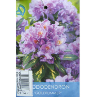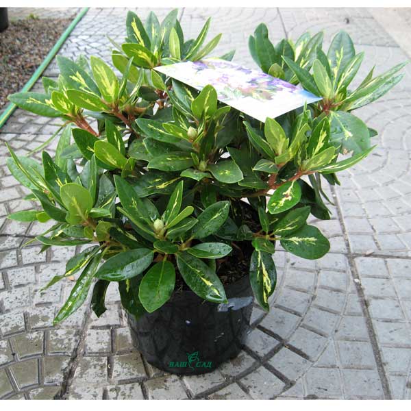 Компактный вечнозеленый кустарник с довольно широкой кроной. Побеги направлены вверх. Цветки крупные, пурпурно-фиолетовые или лиловые. Собраны в компактные соцветия. Листья кожистые, крупные, продолговато-эллиптические, длиной до 16 см, темно-зеленые, блестящие с золотисто-желтым рисунком по центру каждого листа, вечнозеленые. Корневая система поверхностная, чувствительная к уплотнению почвы, рыхлению и затоплению. Зимостоек до -24 С. Предпочитает прохладные, свежие, дренированные, супесчаные почвы, от очень кислых до подкисленных.
