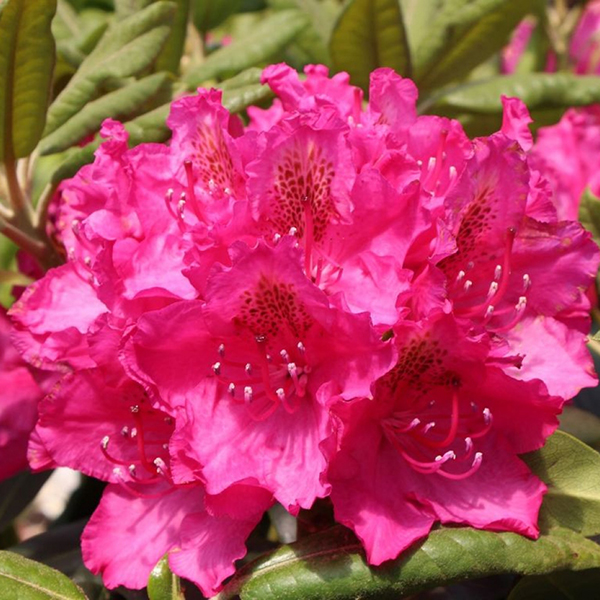 Рододендрон Pearces American Beauty - это широкий раскидистый кустарник. Листья зеленые, блестящие, в длину достигают 15 см. Период цветения длится до трех недель. Цветки воронковидной формы, крупные. Оттенок лепестков цветка от темно-розового до рубинового. Центр цветка украшен золотистым вкраплением. Цветки собраны в соцветия, в каждом из которых может быть до 18 цветков. Сорт устойчив к холодам, но на зиму укрытие желательно. Прекрасно чувствует себя в полутени, на дренированных влажных почвах.