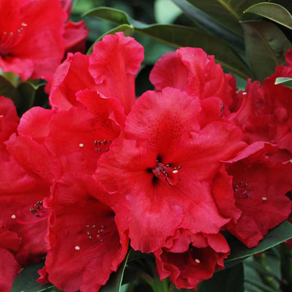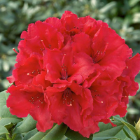 - рододендрон с большими воронкообразными ярко-красными цветами. Вечнозеленые листья овальные, кожистые, темно-зеленые летом и бронзовые зимой. Взрослый кустарник достигает около 2 - 2,5 м в высоту и ширину.