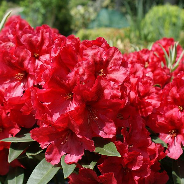 - рододендрон с большими воронкообразными ярко-красными цветами. Вечнозеленые листья овальные, кожистые, темно-зеленые летом и бронзовые зимой. Взрослый кустарник достигает около 2 - 2,5 м в высоту и ширину.
