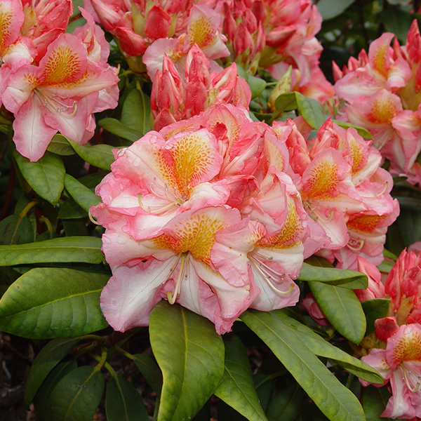 Рододендрон гибридный Сцифокаликс - умеренно морозостойкий гибрид с эффектными красно-оранжевыми цветками. Вечнозелёный, влаголюбивый, хорошо растёт в полутени. Вечнозелёный широкий куст высотой от одного до полутора метров. У него блестящие овальные листья и цветы нежной расцветки, переходящей от оранжевого к красному. В начале и в конце цветения кисти выглядят по-разному, меняя оттенки цветков. Годовой прирост составляет около 15 см. Растение цветёт в конце весны.