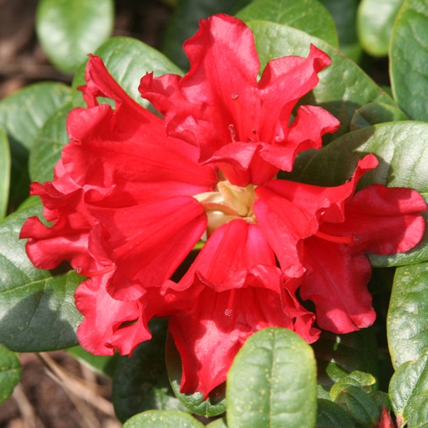 Рододендрон Скарлет Вондер - низкорослый вечнозеленый кустарник, подушковидной формы. Цветы ярко-красного цвета. Достигает высоты 50-60 см. Крона густая, диаметром – 120 см. Листья эллиптические, кожистые, блестящие, длиной до 3-7 см, расположены супротивно, верхняя сторона зеленая, немного шероховатая с белыми редкими волосками, с нижней стороны бархатисто-шероховатые. Цветки широко-колокольчатые, ярко-красные с гофрированным краем, душистые, 3-4 см. в диаметре, собраны зонтиком по 8-10 шт.
