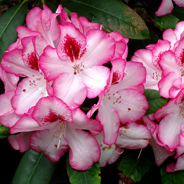 Рододендрон гибридный Hachmanns Charmant - декоративный вечнозеленый кустарник. Куст компактный, высотой до 1,3 м и шириной до 1,5 м (в 10-ти летнем возрасте). Цветение обильное, начинается в конце мая и длится около трех недель. Цветки широко колокольчатые в соцветиях по 17 - 19 шт., очень изысканные и нежные. Окраска двухцветная, общий фон цветка белый, а края лепестков ярко розовые.