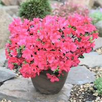 Рододендрон Анук (Rhododendron japanese azalea Anouk) – популярный декоративный сорт с крупными ярко-розовыми цветами. Его можно увидеть на изгородях, в садах или оранжереях. Листья растения овальные и зелёного цвета. В период цветения ярко-розовые душистые бутоны на фоне зелёных листьев создают незабываемое зрелище. Его можно сравнить с душистым цветочным ковром. Анук – хороший выбор для садовода, желающего преобразить свой участок. Описание растения Анук – карликовое растение. В среднем его высота – 25 см. Ширина – 0,5-1 м. Цветение начинается ранней весной. Зимой листья сохраняют зелёный оттенок. Этот сорт растёт в полутени на кислой, влажной почве. Лучшей смесью считается формула:1/3 торфа, 1/3 компоста без извести и 1/3 почвы в месте для посадки. Корни рододендрона Анук мелкие, поэтому его нельзя сажать глубоко. При уходе используют минеральные удобрения. Требуется мульчирование. Преимущества рододендрона Анук Пышное цветение. Морозостойкость до -29?С. Относительная устойчивость при засухе.