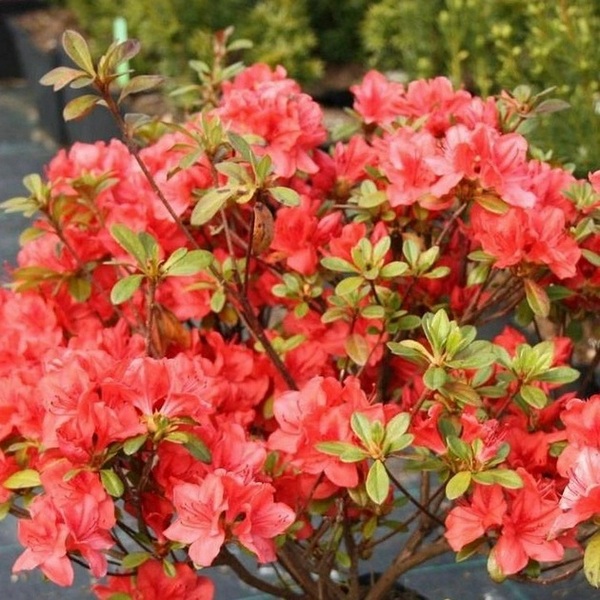 Красно алые с темно-красным рисунком на верхнем лепестке, широкие, колокольчатые. Обильно цветёт во второй половине мая, начале июня.