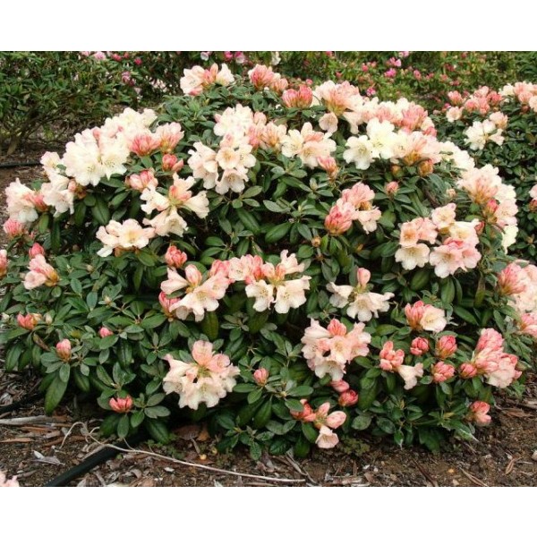 Этот сорт относится к группе Evergreen Hybrids Rhododendron yakushimanum. Высота взрослого растения – 0,6 - 0,9 м. Очень эффектный вечнозеленый, красивоцветущий кустарник. Куст компактный, плотный, округлый. Листья матовые, темно-зеленые. Цветы белые с нежно-розовой окантовкой, собраны в красивые округлые соцветия. Цветет очень обильно в мае. Растет медленно.