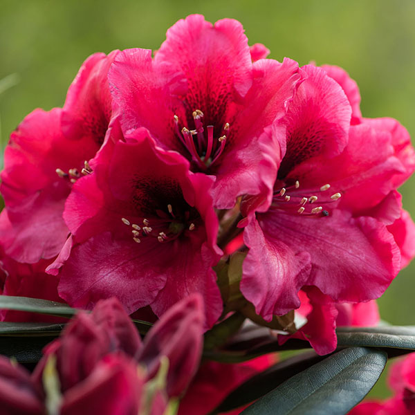 - рододендрон с большими воронкообразными ярко-красными цветами. Вечнозеленые листья овальные, кожистые, темно-зеленые летом и бронзовые зимой. Взрослый кустарник достигает около 2 - 2,5 м в высоту и ширину.