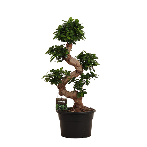Фикус Гинсенг имеет темно-зеленые, широкоовальные, блестящие листья