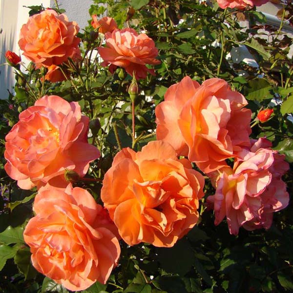 Неплотномахровые, крупные, душистые цветки собраны в соцветия. Окраска их меняется в течение цветения от оранжево-желтой до лососево-абрикосовой, отцветая, они становятся розоватыми. Кусты с крупными нарядными листьями, высотой до 1,5-1,7 м сильно разрастаются в ширину, поэтому хороши и в одиночных посадках. Роза зацветает рано, и цветение длится до поздней осени.