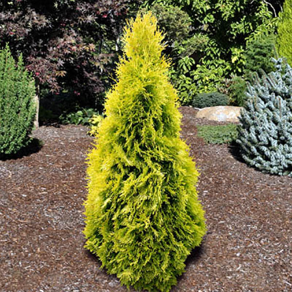 Туя западная Янтарь - новое, вечнозеленое, густое, стройное дерево с регулярной, почти идеально конической, кроной золотисто-желтой окраски. Вырастает до 5 м в высоту. Thuja Jantar неприхотлива, обладает высокой зимостойкостью, устойчива к городским условиям, что позволяет широко применять её в озеленении городов.
