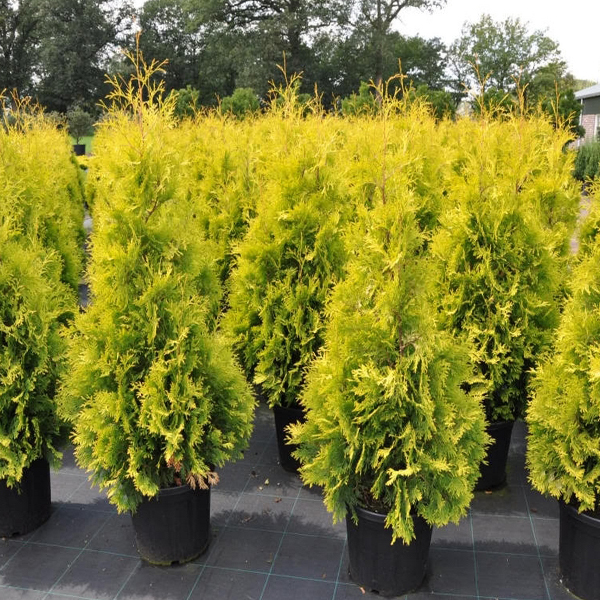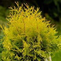 Туя западная Еллоу Риббон (Thuja occidentalis Yellow Ribbon) - вечнозеленое хвойное дерево семейства кипарисових конусовидной формы с плотной кроной, имеет яркую, сочную золотисто-желтую окраску. Самый ценный сорт для изгороди среди туй с золотистой окраской хвои. Позволяет создать интенсивно-оранжево-желтую стену, которая контрастно смотрится на фоне других более темных растений или стен. Диаметр кроны взрослого растения 1,5 м,