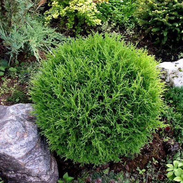 Туя западная Tини Тим (Thuja occidentalis Tiny Tim) - очень медленно растущий, карликовый вечнозеленый кустарник с шаровидной, тонко разветвленной кроной. В 10 лет высота растений этой формы 30 см, диаметр кроны 40 см. Диаметр крона взрослого растения до 1,5 м, высота 0,5-1 м