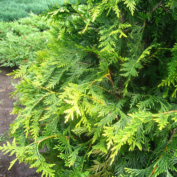 Хвоя - чешуевидная, толстая, плоская, блестящая, окрашена в насыщенный зелёный цвет. Зимой становится темнее. Молодые приросты - ярко-травянисто-зелённые с выраженным золотистым оттенком.