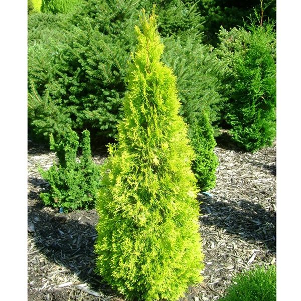 Thuja occidentalis Golden Smaragd - вечнозелёное дерево с узкоколоновидной, плотной кроной, имеет яркую, сочную жёлто-зелёную расцветку. Туя западная Golden Smaragd является новым польским сортом, происходящим от самого популярного сорта туи западной - Smaragd. Нетребовательна и морозоустойчива. Высота взрослого растения достигает 4-6 м, при ширине 1-1,5 м. Скорость роста средняя, около 10-20 см в год. В возрасте 10 лет может вырастать до 2 м.