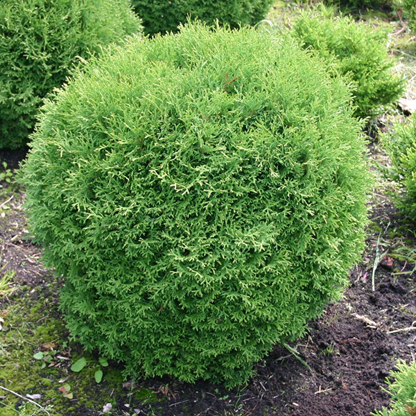Туя западная Tини Тим (Thuja occidentalis Tiny Tim) - очень медленно растущий, карликовый вечнозеленый кустарник с шаровидной, тонко разветвленной кроной. В 10 лет высота растений этой формы 30 см, диаметр кроны 40 см. Диаметр крона взрослого растения до 1,5 м, высота 0,5-1 м