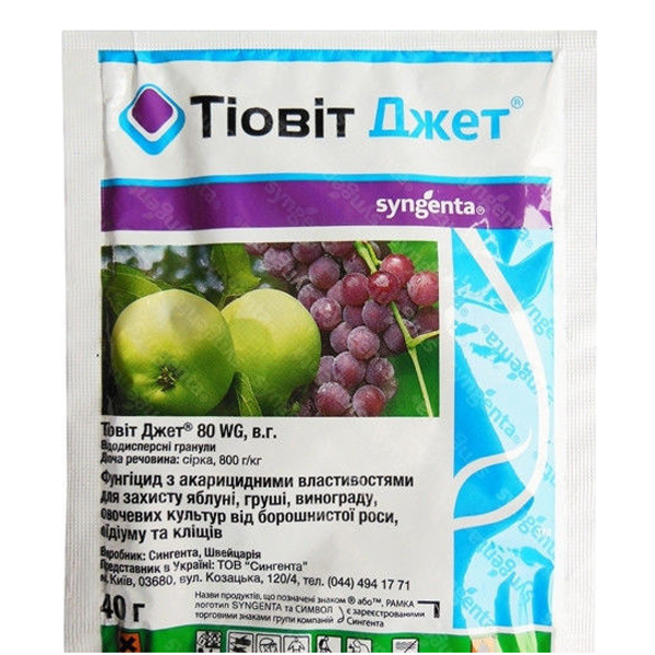 Тіовіт-Джет – комбінований препарат фунгіцид з акарицидними властивостями. Ефективно бореться з різними кліщами, а також борошнистою пащею, кілою і оідіумом. Тіовіт Джет широко використовують для захисту плодових дерев, винограду, огірків, для знешкодження грунту в парниках і теплицях перед посадкою капусти. У стані пропарату у вигляді гранув знаходиться високоякісна cepa, яка бездоганно культивується у воді і добре утримується на обробленій повірці. Захисна дія зберігається до 10 днів. Для приготування робочого розчину вмісту пакета 40 г розбавити в 10 л води. Максимальна кількість обробок: 4, зокрема для профілактики. Інтервал між опрацюваннями: 7-10 днів, залежно від інтенсивності розвитку хвороби.
