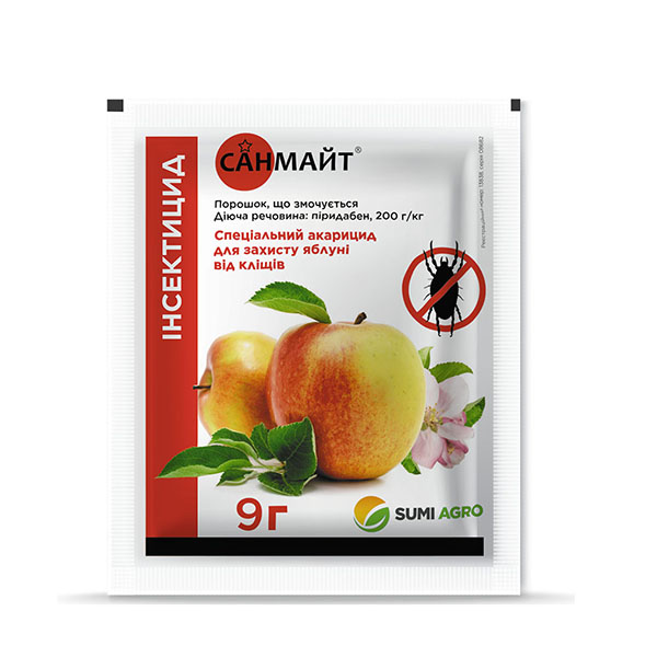Санмайт – універсальний препарат для захисту яблунь від кліщів. Робочий розчин: 5-9 г препарату розчинити у 10-12 л води на 1 сотку. Для досягнення максимальної ефективності дії препарату його необхідно використовувати після цвітіння плодових дерев, коли популяції кліщів досягають максимального рівня. Кратність обробок – одна.