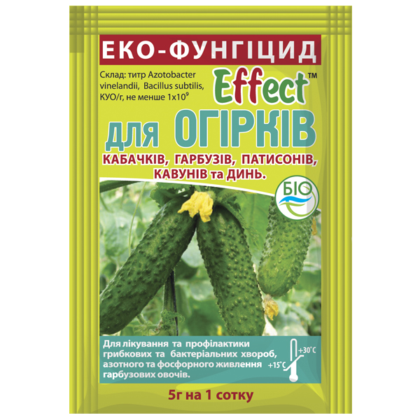 Біофунгіцид EFFECT для огірків - комплекс мікроорганізмів та ферментів (Azotobacter vinelandii, Bacilus subtilis). Ефективний біопрепарат для лікування та профілактики грибкових та бактеріальних хвороб, азотного та фосфорного харчування огірків. Для лікування та профілактики грибкових та бактеріальних хвороб, азотного та фосфорного харчування огірків. захищає огірки від хвороб, безпечно для рослин і себе збільшує врожайність огірків до 30% покращує розвиток рослин збільшує родючість ґрунту Застосування: Огірки, кабачки, гарбузи, патісони, кавуни Коренева гнилизна бактеріальний рак, фузаріозне в'янення Передпосівне замочування насіння на 1-2 години (100мл на 100 г насіння) 1 г/л води Борошниста роса, пероносопроз Обприскування в період вегетації з інтервалом 10 -15 м2 /5 л води Робочий розчин готують за 1-2 години до обробки. Для цього вказану в таблиці кількість препарату розвести у воді, помішуючи дерев'яним предметом. Витрати води становлять 5л/100 м2. Рекомендуємо проводити опр