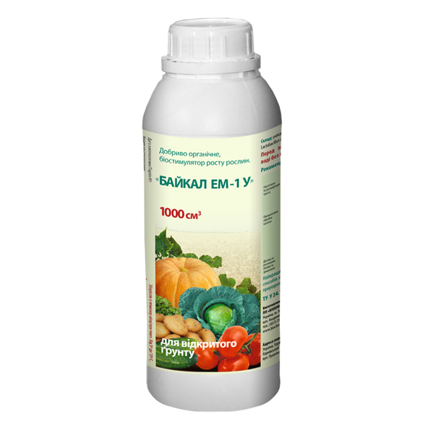 Байкал ЕМ1 - мікробіологічне добриво для відновлення родючості різних типів ґрунтів, вирощування овочевих, плодово-ягідних, квітково-декоративних культур, прискорення дозрівання компосту. Склад добрива Байкал ЕМ1. Молочнокислі, фотосинтезуючі бактерії, бактерії, що фіксують азот, цукроміцети, культуральна рідина. Можливі засоби застосування добрива Байкал ЕМ1. Приготування компосту. Обробіток ґрунту. Обробка насіння. Обприскування розсади та кімнатних рослин. Позакоренева та коренева обробка рослин. Добриво Байкал ЕМ1 не містить генномодифікованих мікроорганізмів. Серія добрив Байкал ЕМ1: Біодобрива Байкал ЕМ1, 33мол. Байкал концентрат ЕМ1, 50мол. Біодобрива Байкал ЕМ1, 500мол. Біодобрива Байкал ЕМ1, 1л. Біодобрива Байкал ЕМ1, 5л. Біодобриво Байкал ЕМ1, 10л.