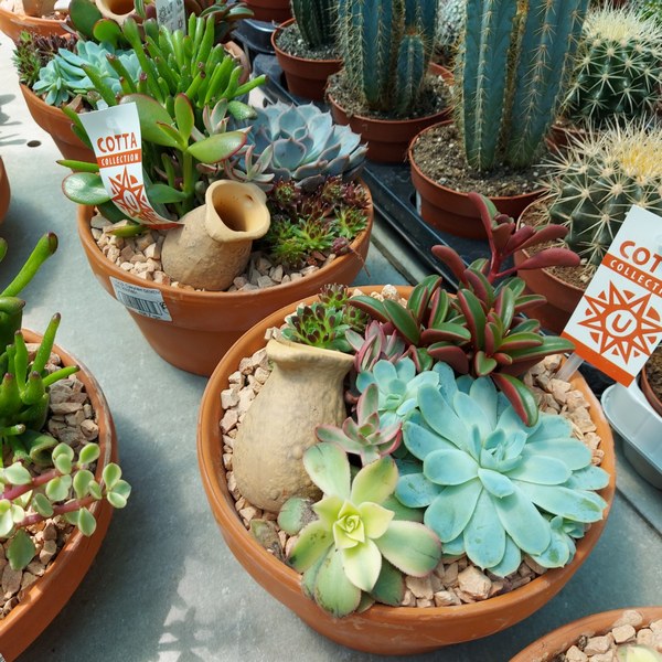 Композиція з кількох видів сукулентів у керамічному горщику з декором. Варіанти в асортименті уточнюйте у консультантів. Рекомендації з посадки та догляду: Оптимальна температура в зимовий період: 8 - 12°C Освітлення: сонячне підвіконня, вікна з південною, східною або західною орієнтацією. Полив: при повному підсиханні ґрунту Вологість повітря: мириться з сухістю повітря, не вимагає частого обприскування Добрива: для кактусів та сукулентів Пересадка: при необхідності зі спеціальним ґрунтомешанням для кактусів та сукулентів.