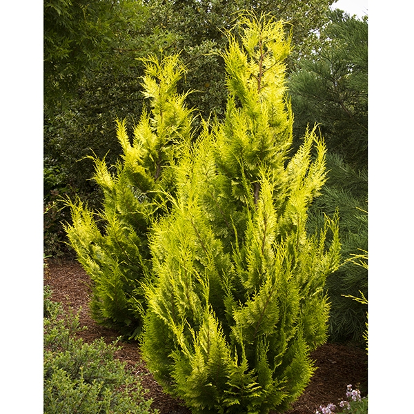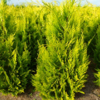 Кіпарисовик Лавсона Івонне - найкраща жовта форма кипарисовика Лавсона. Є хвойним вічнозеленим деревом з конічною щільною кроною. У висоту досягає 5-7 (10) м, завширшки 2-3 (4) м. Рослина швидкозростаюча. У 10 років зростає до 2,5 м заввишки. Верхівка вузька, зазвичай схилена на бік. Кора червонувато-коричнева, товста. Гілки спрямовані прямо, розгалужені віялоподібно. Хвоя лускоподібна, золотисто-жовтого або жовтого кольору. Взимку фарбування не змінює. У тіні стає салатовою. Строкатість забарвлення залежить від вологості та родючості грунту. Шишки яйцевидно-кулястої форми, 8-10 мм у діаметрі. Чоловічі шишки рожеві чи малинові, жіночі – зелені чи коричневі. Місцерозташування: Світлолюбний, але може зростати і в півтіні. Ґрунт любить живильне та вологе, але без застою води. Не любить сухості ґрунту, ущільнення, особливо верхніх шарів та засіпання приствольного кола. Посадка: Яму риють глибиною та діаметром не менше 50 см. Ґрунтова суміш: перегній, дернова земля, торф, пісок у пропорції 3:2:1:2. При посадці вносять мінеральне добриво – 5-6 кг торфокомпоста, перемішуючи його із землею. Обрізка: добре переносить стрижку Догляд: навесні можна підгодувати кемірою (100-150 г), розсипавши її навколо пріствольного кола і, після цього, рясно полити рослину. У квітні-травні можна внести нітроамморфоску (30-40 г). Рекомендується також вносити верховий торф - підсипати поверхню кілька разів за сезон. Осіннє підживлення не рекомендується. Потребує мульчування і прополювання приствольного кола. У сухий період необхідний полив. Використання: в одиночних та групових посадках, для садових композицій як кольоровий елемент, для міксбордерів та бордюрів.