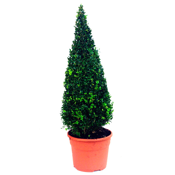Форма: У природному середовищі він має розлогу конусну форму. Але завдяки своєму густому зростанню гілок і листя його можна формувати в будь-які зелені скульптури. Розмір: У віці 10 років самшит досягає 5 метрів заввишки та 2 у діаметрі (це за умов відсутності обрізки). Зростання повільне. Середній річний приріст трохи більше 5 сантиметрів. Листяка: Дуже м'ясиста, щільна. Листя розташоване симетрично на гілки, росте густо. Букшпан не скидає листя в холодну пору року. Коренева система: Глибока і добре розгалужена. За рахунок поглибленості коренів, самшит відмінно переносить сильні вітри та промерзання ґрунту. Тому підходить для посадки у будь-яких регіонах. Рекомендації з посадки: Чагарник невибагливий до умов зростання. Грунт може бути будь-який, крім кам'янистої. Слід уникати надмірної зволоженості ґрунту – це може сприяти загниванню кореневої матки. Лунка для посадки за розмірами має відповідати земляному ком саджанця самшиту. У посадкову яму для кращого вкорінення часто додають торф і дерен. Догляд: Це дуже вологолюбний чагарник. Його потрібно регулярно обприскувати для зволоження листя та пагонів. Полив помірний, у міру висихання ґрунту. Добрива вносяться двічі на місяць у період активного зростання і 1 раз на 30 днів після настання періоду спокою. Особливості: Це ідеальна рослина для топіарної стрижки. Фахівці можуть надати чагарнику практично будь-яку форму: геометричну, арочну, фігурну тощо. Використання в дизайні: Самшит у ландшафтному дизайні вважається улюбленою рослиною декораторів. З нього легко створюються живоплоти та зелені скульптури. За допомогою букшпану прикрашають альпінарії, розарії, квітучі клумби. Рослина сформована у вигляді конуса. Висота рослини 90-100 см