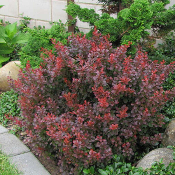 Барбарис Тунберга (Berberis thunbergii) - невисокий, квітучий, листяний чагарник із сімейства Барбарисові. Як і його побратими, цей чагарник має дуже високі декоративні властивості. Атропурпуреа Нана - червонолистий карликовий сорт, з гстій округлою кроною. Плоди яскраво-червоні, блискучі, розміром до 1 см, дозрівають у вересні-жовтні, зберігаються на гілках до середини зими. Крона густа, компактна, подушкоподібна. Висота барбарису Тунберга Атропурпуреа Нана до 0,6 м, діаметр крони 1 м. Щорічний приріст у висоту 3-4 см, завширшки 6-8 см. -5 штук. Листя довжиною 1-2 см округлі пурпурно-червоні, восени кармінно-червоні. Стійкий до міських умов, стійкий до вітру. Використовується у групах, бордюрах, альпінаріях. Особливості посадки: Місцем для посадки краще вибрати схил, головне уникати сильно-продувних місць. Посадкова яма має бути глибиною приблизно 40 см. Землю слід змішати з вапном, піском та перегноєм. У перші два тижні молоду рослину потрібно поливати регулярно і рясно, підтримуючи постійну вологість. Добрива: У перші роки життя молодий барбарис бере всі потрібні компоненти з посадкової ями, саме тому так важливо удобрювати землю при посадці. Ця рослина дуже сприятливо відгукується на добрива, до складу яких входить азот. Догляд: У молодих рослин обов'язково потрібно прищипувати пагони, це формує майбутній вигляд куща. Землю навколо куща потрібно прополювати і злегка розпушувати, це дасть можливість кущу розростатися, до того ж постійне розпушування забезпечить надходження потрібного кисню. Морозостійкість: Середня. На зиму кущ барбарису потрібно обов'язково накрити, добре для цього підійде лапник. Якщо рослина широко розрослася, її доведеться захистити циліндричною конструкцією з металевої сітки, для цього гілки потрібно туго стягнути мотузкою, а простір між кущем і сіткою заповнити сухим листям. Розмноження: Один із простих способів розмноження - живцювання. Свіжі живці слід опустити на пару годин у стимулятор, підійде епін або гетероауксин. Відведення також добре приживаються. Рослини віком 3-5 років, добре розмножуються методом поділу кореня.