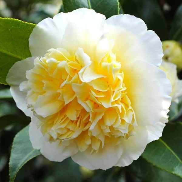 Камелія Jury's Yellow - морозостійкий піоноподібний сорт з вічнозеленим листям. Суцвіття виглядає чудово: по краях широкі білі пелюстки, середина нагадує помпон із атласної стрічки у вершково-жовтих тонах. Рослина в саду зросте до кількох метрів, але легко переносить обрізання, дозволяючи створити елегантне деревце або пишний кущ. У будинку розміри компактніші, зате простіше створити умови для тривалого цвітіння. Квітам для формування та розкриття необхідна відносна прохолода (+8-15 ° С), помірні поливи та розсіяне світло. Екзотичний багаторічник найпростіше виростити з дорослого саджанця (Нідерланди) - замовляйте на сайті Яскрава Клумба зараз, поки махровий сорт є в наявності.