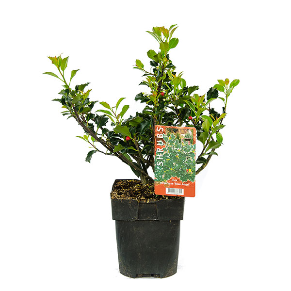 Падуб Мезерва Блю Янгол - це вічнозелений чагарник, що повільно росте, до 1,5 м заввишки, з густою компактною кроною і прямими втечами. Листя щільне, блискуче, шкірясте, з колючими зубцями по краях, синьо-зелені. Цвіте у травні, білими квітками. Плоди – червоні ягоди, до 7 мм у діаметрі, залишаються на рослині до весни. Невимогливий до освітлення, може рости як на сонці, так і в тіні. Віддає перевагу пухким, проникним, вологим грунтам, але без застою води. Щодо морозостійок – бажано укриття на зиму. Швидко відростає після обрізки.