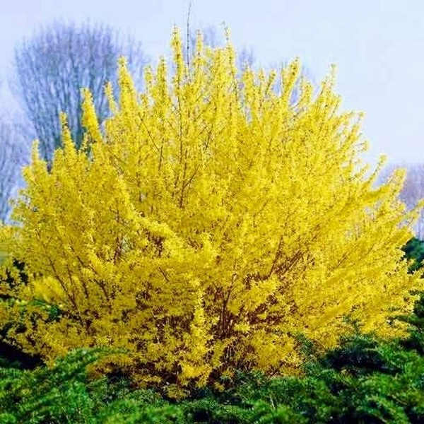 Форзиція – ранньоквітучий красивоквітучий листопадний чагарник заввишки 0,7-1м. Форма крони щільна, округла не вимагає формування. Кущ форзиції розквітає ще до розпускання листя, її гілки густо обсипані золотистими квітками, схожими на дзвіночки. Час цвітіння – березень-квітень. Забарвлення квіток - світло-жовте. Діаметр квіток 2-3 см. Неймовірно рясне цвітіння. Листя просте, довгасте або овально-ланцетове, до 10см завдовжки, грубо зубчасте по краю. Форзиція добре росте на сонячному місці та в півтіні, але краще висадіть її у тепле, захищене від вітру місце. Росте на будь-яких родючих ґрунтах. Чагарник форзиції у морозні зими може підмерзати. Щоб цього не трапилося, восени пагони пригніть до землі і вкрийте їх лапником або іншим покривним матеріалом. Підходить для штамбової культури.