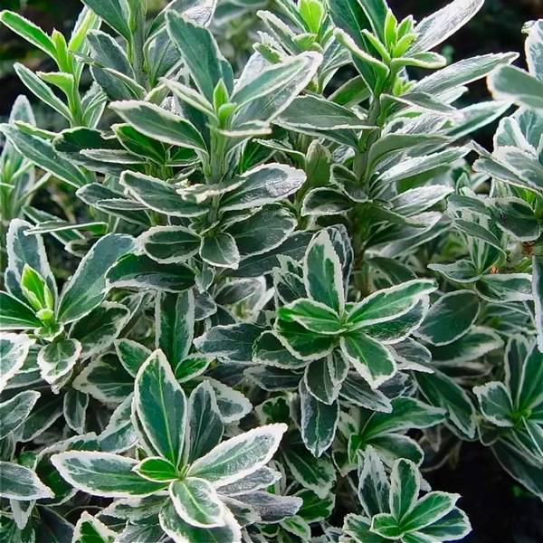 Бересклет японський Мікрофілус Альбоварієгата – багаторічний чагарник із щільною округлою кроною. Гілочки ростуть вертикально і досить повільно. Висота дорослого бруслини не перевищує метра (зазвичай 70-90 см). Її можна регулювати обрізанням. Ширина крони – близько 60 см. Цей сорт є вічнозеленим, з високою декоративністю. Листя у нього темно-зелене, маленьке з вузькою білою облямівкою. На початку літа з'являються квітки, зібрані в зонтикоподібні суцвіття. Вони зеленувато-жовті, малопомітні. Рослина може використовуватися як живоплот. Укорінюється як у кислих, і на лужних грунтах. Добре переносить сонце та півтінь.