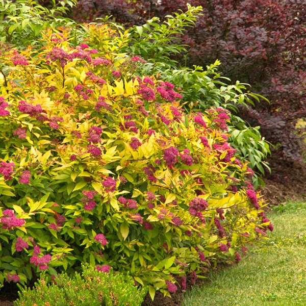 Спірея японська Голдфлейм - невеликий, густий декоративний кущ напівкулястої форми, висотою до 80 см. Один з найкращих представників серед рослин з жовтим забарвленням. Змінює колір листя на протязі сезону: від оранжево-червоного навесні, через яскраво-жовтий під час цвітіння, до мідно-жовтогарячого восени. Добре росте у міських умовах. Цвіте з червня до серпня дрібними лілово-рожевими квітами. Сорт невибагливий, морозостійкий. Загальна характеристика: Повільно зростаючий напівкулястий чагарник