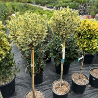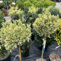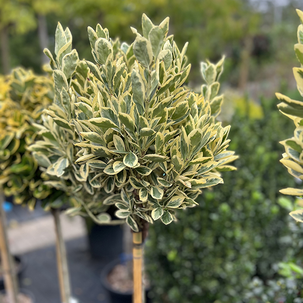 Euonymus japonicus Bravo - вічнозелений декоративний чагарник з темно-зеленим глянцевим листям, яке має яскраво-білу або кремову кайму, створюючи строкато-білий ефект.