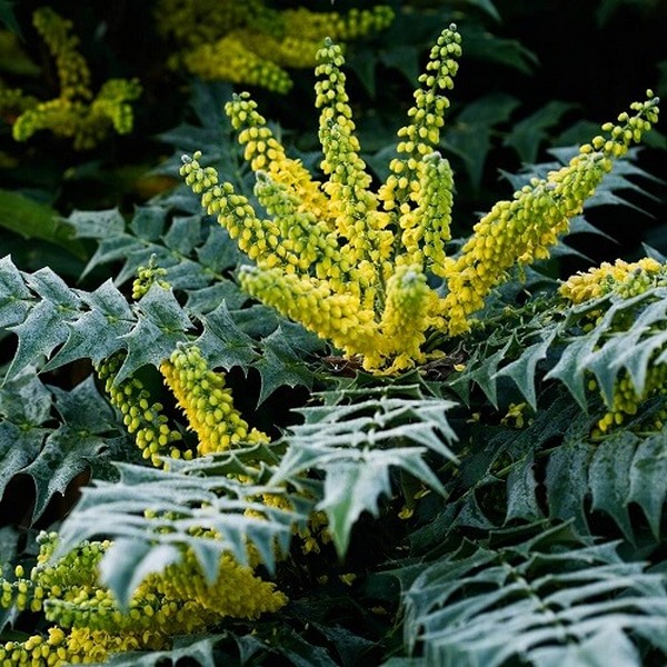 Вічнозелений декоративний кущ із щільною прямостоячою кроною. Головна особливість - велике, блискуче, темно-зелене листя із загостреними краями, що нагадує падуб. Восени та взимку рослина вражає яскраво-жовтими, запашними квітами, зібраними у довгі, прямостоячі кисті. Відзначається стійкістю до хвороб, тіньовитривалістю та невибагливістю у догляді.