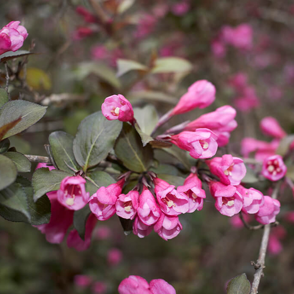 Вейгела квітуча Фоліс Пурпуреус, (Weigela florida Foliis Purpureis) - чагарник від 1 до 1,5 м заввишки з густою кроною діаметром близько 2 м. Листя еліптичне, коричнево-червоне, червоно-зелене, довжиною 6 - 8 см, восени довго залишаються на гілках. Квітки довжиною 2,5 - 3 см, темно-рожеві з жовтою серединкою, зібрані в суцвіття по 3 - 4 штуки, контрастують з листям. Цвіте у червні-липні. Щорічний приріст у висоту і ширину 20 - 30 см. Місцерозташування: світлолюбні, кращого розвитку досягають на відкритих, добре освітлених місцях. Окремі види виносять невелике затінення і добре розвиваються під пологом крон. Квітки та листя легко ушкоджуються вітром, тому садити її слід у захищених місцях, особливо від північних вітрів. У тіні вейгели слабо цвітуть, затримується дозрівання насіння та здеревення пагонів. Грунт: Добре росте на пухких свіжих ґрунтах, але погано цвіте на перезволожених ґрунтах. Посадка: відстань між кущами не менше 1,5 -2 м, краще за 2,5 -3 м. Глибина посадки 50 - 60 см, коренева шийка на рівні землі. Розміри ями 50х50 см.