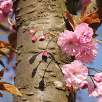 Сакура Канзан (Kanzan, декоративна слива, японська вишня) – це неймовірно красиве декоративне дерево. Цей сорт японської вишні є невисоким (виростає до 12 метрів), має сильну крону з великою кількістю суцвіть у період цвітіння. Цвітіння сакури продовжується 2 тижні, після зав'язуються плоди. Вишеньки (лили сливи) є темно-сині, майже чорні, або фіолетові горошини, гірко-кислі на смак. Особливості сорту: Сакура Канзан – чарівне дерево невисокого зросту. Відмінно почувається в місті, може рости на суглинках або ґрунтових сумішах. Має приємний гладкий ствол світло-коричневого кольору. З віком кора стає темнішою і покривається елегантними тріщинами. Характеристики плода: Темні, практично чорні ягоди, непридатні для вживання. Період дозрівання: Середина весни. Урожайність: Низька, плоди не використовуються в харчових цілях. Форма крони: Перевернутий конус. Молоді гілки звисають над землею, основні паралельні стовбуру, спрямовані у небо. Рекомендації з посадки та догляду: Сакура Канзан - це дуже теплолюбна рослина, її варто купити, якщо ділянка південного або південно-східного розташування. Дерево погано переносить різкі перепади температури та протяги, тому місце має бути добре освітленим, на височині. Лунка повинна трохи перевищувати розміри кореневої системи, для засипання коренів використовується суміш із верхового торфу, перегною та піску. У ямі обов'язково облаштовується дренаж. Догляд за сакурою Канзан дуже своєрідний. З настанням перших холодів стовбур потрібно огортати мішковиною, а ґрунт навколо дерева мульчити. Удобрюється декоративна злива двічі на рік: перед рухом соку і після цвітіння. Висота рослини – 175-200 см.