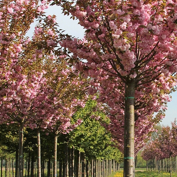 Сакура Канзан (Kanzan, декоративна слива, японська вишня) – це неймовірно красиве декоративне дерево. Цей сорт японської вишні є невисоким (виростає до 12 метрів), має сильну крону з великою кількістю суцвіть у період цвітіння. Цвітіння сакури продовжується 2 тижні, після зав'язуються плоди. Вишеньки (лили сливи) є темно-сині, майже чорні, або фіолетові горошини, гірко-кислі на смак. Особливості сорту: Сакура Канзан – чарівне дерево невисокого зросту. Відмінно почувається в місті, може рости на суглинках або ґрунтових сумішах. Має приємний гладкий ствол світло-коричневого кольору. З віком кора стає темнішою і покривається елегантними тріщинами. Характеристики плода: Темні, практично чорні ягоди, непридатні для вживання. Період дозрівання: Середина весни. Урожайність: Низька, плоди не використовуються в харчових цілях. Форма крони: Перевернутий конус. Молоді гілки звисають над землею, основні паралельні стовбуру, спрямовані у небо. Рекомендації з посадки та догляду: Сакура Канзан - це дуже теплолюбна рослина, її варто купити, якщо ділянка південного або південно-східного розташування. Дерево погано переносить різкі перепади температури та протяги, тому місце має бути добре освітленим, на височині. Лунка повинна трохи перевищувати розміри кореневої системи, для засипання коренів використовується суміш із верхового торфу, перегною та піску. У ямі обов'язково облаштовується дренаж. Догляд за сакурою Канзан дуже своєрідний. З настанням перших холодів стовбур потрібно огортати мішковиною, а ґрунт навколо дерева мульчити. Удобрюється декоративна злива двічі на рік: перед рухом соку і після цвітіння.