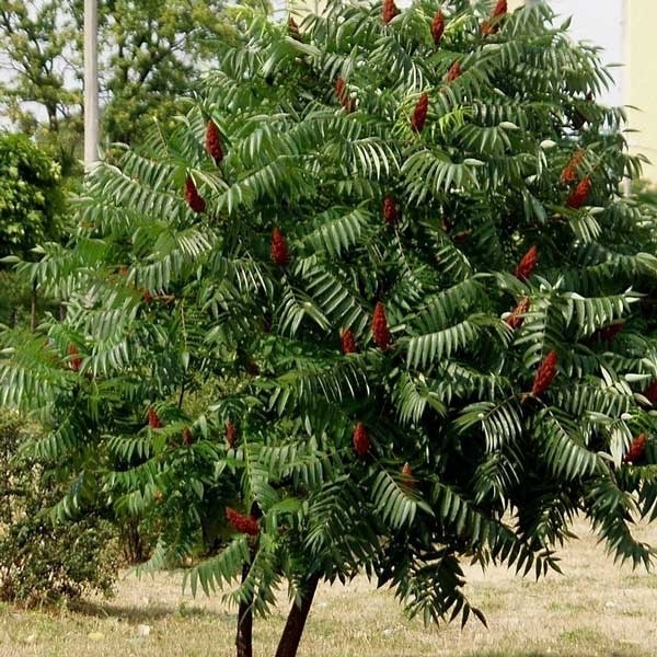 Дерево сумах (оцтове дерево), сумах оленерігій - належить до сімейства сумахових. Батьківщиною його є Північна Америка, а найбільшого поширення він набув у Сполучених Штатах Америки та Канаді. Є невеликим деревом з лежачим стовбуром або багатоствольним чагарником до 4 м заввишки і 6 м завширшки. Крона зонтикоподібна, розлога. Сумах оленерігий зовні чимось схожий на пальму. Така ж розлога крона з великим розсіченим листям. Стовбур коричневого забарвлення бархатистий, що нагадує відчуття панти оленя. Особливістю сумаха є його декоративність протягом усього року. Але пік її, звичайно, припадає на осінь. Дивовижне яскраво-червоне забарвлення листя і багряні суцвіття, дуже схожі формою з квітучим каштаном. Взимку, коли блякнуть всі фарби і все навколо стає досить похмурим, сумах продовжує радувати нас своїми плодами, маленькими червоними кістянками, зібраними в волоті. Бажаючим стати власником цієї рослини необхідно врахувати, що плоди утворюються лише в особин жіночої статі. У висоту сумах може досягати до десяти метрів, але у міському середовищі та на дачах він рідко перевищує два метри. Місцерозташування та ґрунт: Незважаючи на свою зовнішню екзотичність це досить невибаглива рослина. До ґрунтів невимогливий (виживає навіть на кам'янистих вапняках), посухостійкий, у зимовий період укриття не вимагає. Єдине, що потрібно врахувати при його посадці – освітлення. Рослина потрібно садити на добре освітлених ділянках. Бажано, щоб ділянка була захищена від вітрів та протягів. Посадка: При посадці та подальшому вирощуванні необхідно знати про одну важливу особливість сумаха. Він надзвичайно швидко розростається. Причому сини виникають досить великій відстані від батька. Цей момент необхідно враховувати, плануючи інші посадки. Рекомендована відстань між рослинами – 2 м. При посадці необхідно заглиблювати кореневу шийку на 3-5 см. Оптимальний період посадки – з березня по листопад. Після посадки необхідно рясно полити дерево і замульчувати торфом. Безперечною перевагою сумаха є його стійкість до різноманітних захворювань. Використання: Плоди сумаха мають дуже кислий смак. Їхній відвар нагадує оцет. Звідси швидше за все і друга назва цієї рослини – оцтове дерево. Відомо, що корінне населення знаходило практичне застосування плодам та корі рослини. Кору дерева, що містить дубильні речовини, використовували в народній медицині як в'яжучий засіб. Крім того, ця властивість кори робила її незамінною при виробленні шкіри. З плодів виробляли фарбу, яка вважалася дуже стійкою і використовувалася при фарбуванні тканин червоного кольору. Однак головне призначення сумаха оленерогого, завдяки його високим декоративним якостям та невибагливості, - це прикраса наших садів та парків. Він є незамінною рослиною у ландшафтному дизайні. Використовується в одиночних та групових посадках, для створення заростей та маскувань об'єктів, у складних композиціях та обсадженні галявин, для закріплення схилів та берегів.