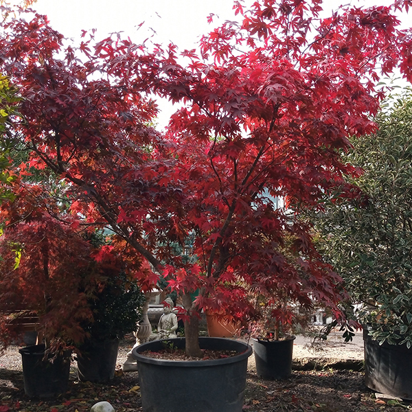 Клен віяловий Атропурпуреум - японський гість у Вашому саду. Залежно від обрізки рослині можна надати форму чагарника чи дерева. Головною особливістю є широка крона із листям пурпурового кольору. Форма: Розлога, зонтикоподібна. Розмір: Дорослий клен виростає до 4 метрів заввишки та 3 у діаметрі. Характеризується швидким приростом – до 10 сантиметрів на рік. Коли дерево сягає 10 років, зростання уповільнюється до 7 сантиметрів. Листяка: Лопатева, з яскравими прожилками. Навесні та влітку листя насиченого червоного кольору, ближче до осені темніє. Корнева система: Розвинена, не глибока. Характеризується гарною розгалуженістю. Рекомендації з посадки: Атропурпуреум не переносить яскравих сонячних променів, посухи та надлишку вологи. Найкраще місце для посадки – східна сторона двору. Посадкова лунка обов'язково готується заздалегідь. Важливо додати до ґрунту добрива пролонгованого типу дії та забезпечити в ямі гарний дренаж. Глибина лунки в 1.5 рази має перевищувати розміри коренів клена. Догляд: Навесні до початку руху соку проводиться санітарна обрізка. Щомісяця обов'язково вносяться мінеральні чи спеціалізовані добрива для листяних. Полив має бути регулярним, але помірним. Не можна допускати повного пересихання ґрунту. Грунт у зоні посадки потрібно розпушувати кілька разів на місяць. Особливості: Пальмолистий клен відноситься до гібридних сортів. Його саджанці швидко вкорінюються і мають високу стійкість до захворювань і негативних зовнішніх факторів. Використання в дизайні: Застосовується для групових насаджень у парках чи лісах. Ландшафтні дизайнери рекомендують купити клен Атропурпуреум для декорування саду або хвойних пролісків.