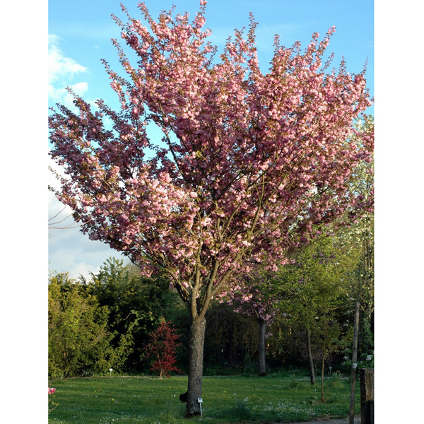 Сакура Канзан (Kanzan, декоративна слива, японська вишня) – це неймовірно красиве декоративне дерево. Цей сорт японської вишні є невисоким (виростає до 12 метрів), має сильну крону з великою кількістю суцвіть у період цвітіння. Цвітіння сакури продовжується 2 тижні, після зав'язуються плоди. Вишеньки (лили сливи) є темно-сині, майже чорні, або фіолетові горошини, гірко-кислі на смак. Особливості сорту: Сакура Канзан – чарівне дерево невисокого зросту. Відмінно почувається в місті, може рости на суглинках або ґрунтових сумішах. Має приємний гладкий ствол світло-коричневого кольору. З віком кора стає темнішою і покривається елегантними тріщинами. Характеристики плода: Темні, практично чорні ягоди, непридатні для вживання. Період дозрівання: Середина весни. Урожайність: Низька, плоди не використовуються в харчових цілях. Форма крони: Перевернутий конус. Молоді гілки звисають над землею, основні паралельні стовбуру, спрямовані у небо. Рекомендації з посадки та догляду: Сакура Канзан - це дуже теплолюбна рослина, її варто купити, якщо ділянка південного або південно-східного розташування. Дерево погано переносить різкі перепади температури та протяги, тому місце має бути добре освітленим, на височині. Лунка повинна трохи перевищувати розміри кореневої системи, для засипання коренів використовується суміш із верхового торфу, перегною та піску. У ямі обов'язково облаштовується дренаж. Догляд за сакурою Канзан дуже своєрідний. З настанням перших холодів стовбур потрібно огортати мішковиною, а ґрунт навколо дерева мульчити. Удобрюється декоративна злива двічі на рік: перед рухом соку і після цвітіння.