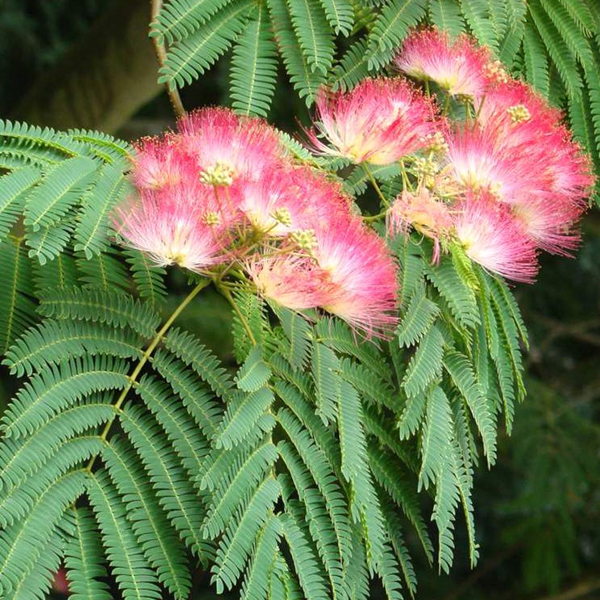 Акація шовкова або (Albizia julibrissin) - листяна квітуча рослина із сімейства Бобових. Звичайне на вигляд деревце, в період цвітіння перетворюється на справжню казку. Пишні махрові суцвіття викликають справжнє захоплення, за що цей вид отримав у народі назву "шовкова квітка". Форма: У молодих представників куляста. З віком крона розростаючись, набуває зонтичного обрису. Верхні гілки довші і спадаючі, за рахунок чого верхівка має трохи поникаючий вигляд.