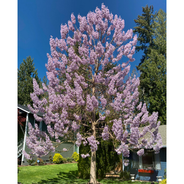 Павловнія або Адамове дерево – багаторічна високоросла (до 15 – 20 м у висоту) та швидкоросла листопадна рослина з дуже великим листям (від 20 см до 50 см) та красивими запашними суцвіттями (до 30 – 50 см завдовжки) ) з ніжно-фіолетових (іноді білих) кольорів. Темпи зростання дерева випереджають усі дерев'яні рослини, що існують у світі, і вже в 8 - 9-річному віці його деревина досягає повної зрілості. Деревина павловнії використовується при виготовленні пресованих матеріалів, стелажів, фанери, меблів та навіть музичних інструментів. Листя павловії також унікальні за своїм хімічним складом. Вони містять до 20% протеїнів (білків), за смаковими характеристиками нагадують зелень люцерни, конюшини, тому є цінним кормом у тваринництві. Можуть використовуватись і для салатів. До того ж вони здатні поглинати вдесятеро більше вуглекислого газу, ніж листя звичайних дерев. Листя: Темно-зеленого кольору, великих розмірів діаметром близько 50-70 см, бархатисті, на довгих черешках. Квітки: Великі шириною до 6см, запашні, що видають ванільний, злегка мигдальний аромат, фіолетово-блакитного кольору, усередині з жовтою смужкою, чашка дзвонової форми. Квіти зібрані в суцвіття-метелик довжиною до 30 см. Ще до розпускання листя в квітні-травні. Плоди: Зелені коробочки широкояйцевидної форми, довжиною 30-45 мм, містять безліч крилатого насіння, при дозріванні у вересні-жовтні місяці стають коричневими і залишаються висіти на дереві всю зиму. Плодоношення починається з 5-6 років. Місцерозташування та ґрунт: Рекомендуємо висаджувати на теплих, сонячних ділянках, захищених від зимових вітрів. Часткова тінь допустима, але відкрита сонячна ділянка краща. Невибаглива рослина, чудово росте на родючих глинистих, добре дренованих ґрунтах. На бідних ґрунтах уповільнюється зростання.