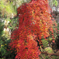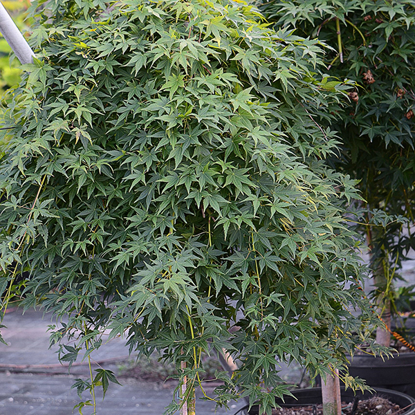 , із унікальною плакучою формою та пальмоподібним листям, яке навесні має яскравий зеленувато-жовтий колір, а восени перетворюється на відтінки від яскраво-червоного до темно-помаранчевого. Він є повільно зростаючим деревом або чагарником, який створює ефект "живого водоспаду" завдяки своїм спадаючим пагонам і використовується як солітер, в групових посадках або контейнерних патіо. Клен віддає перевагу сонячним або напівтінистим місцям із захистом від сильного вітру і прямих полуденних променів, а також вологі, добре дреновані ґрунти.