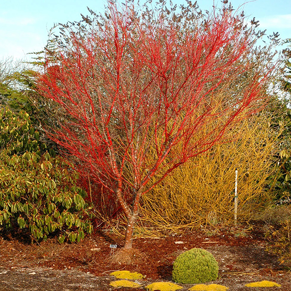Листя: Навесні листя жовто-зелене з червоними краями, влітку стає світло-зеленим, а восени набуває жовтувато-золотистого кольору. Пагони: Взимку пагони набувають яскравого коралово-червоного кольору, що робить дерево декоративним цілий рік. Форма: Росте як невеликий чагарник або дерево, часто з кількома стовбурами, утворюючи широку крону. Місцерозташування та ґрунт: Краще росте на сонячних або напівзатінених ділянках, захищених від сильних вітрів. Віддає перевагу родючим, вологим і добре дренованим грунтам слабокислої реакції. Добре зимує в українських умовах, але за сильних морозів може знадобитися укриття. Використання ландшафтного дизайну: Для прикраси парків, скверів, а також для створення зимового акценту в саду завдяки яскравим пагонам. "/>