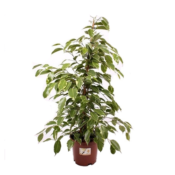 Фікус Бенджаміна Голден Кінг, Ficus benjamina Golden King - невисоке, квітуче, вічнозелене дерево із сімейства Тутові. Це найпопулярніший і найчастіше використовуваний вид з роду фікусових. Простота та дешевизна у вирощуванні, гарний естетичний вигляд, зробили це дерево найбажанішим мешканцем оранжерей та простих міських квартир. Період цвітіння: У штучному середовищі, в квартирах та кімнатах, не дає квітів і не плодоносить. В оранжереї таке деревце, при досягненні зрілого віку, у період з весни до осені, може давати невеликі суцвіття, як плодів (ягід) червоного кольору. Видовище це заворожує, але трапляється вкрай рідко. Догляд: Влітку, при підвищенні температур і посусі, рослині потрібен злегка теплий душ, добре почуватиметься на балконі або відкритій лоджії. Дуже важливо берегти його від протягів. Навесні у дорослої рослини потрібно обрізати пагони, це полегшує дерево і дає можливість сформувати крону. Температура вмісту та вологість: Дуже теплолюбні, влітку оптимальною температурою буде 18-25 градусів, при цьому обов'язково потрібно підтримувати високу вологість повітря, періодично обприскуючи листя. Взимку температура не повинна бути нижчою за 16 градусів, також фікус краще прибрати подалі від радіаторів, які сушать повітря, не менше ніж на 2 метри. Оптимальне освітлення: Досить яскраве, але не інтенсивне. Краще місце для нього буде в півтіні, так його листя набуває здорового красивого забарвлення, якщо це південне вікно, квітка краще відсунути від прямих променів. Взимку по можливості підсвічувати, пожовкле листя ознака нестачі світла. Внесення добрив: З початку весни до кінця осені, слід поливати почергово мінеральними та органічними розчинами, достатньо раз на два тижні. Полив: Регулярний, помірний. Один раз на два тижні, злегка теплою очищеною водою, включаючи ґрунт та листя. Не можна допускати застою води в піддоні, тому рослина може скинути частину листя. Фікус Бенджаміна Голден Кінг, Ficus benjamina Golden King або плакуча смоківниця - невисоке, квітуче, вічнозелене дерево із сімейства Тутові. Це найпопулярніший і найчастіше використовуваний вид з роду фікусових. Простота та дешевизна у вирощуванні, гарний естетичний вигляд, зробили це дерево найбажанішим мешканцем оранжерей та простих міських квартир. Період цвітіння: У штучному середовищі, в квартирах та кімнатах, не дає квітів і не плодоносить. В оранжереї таке деревце, при досягненні зрілого віку, у період з весни до осені, може давати невеликі суцвіття, як плодів (ягід) червоного кольору. Видовище це заворожує, але трапляється вкрай рідко. Догляд: Влітку, при підвищенні температур і посусі, рослині потрібен злегка теплий душ, добре почуватиметься на балконі або відкритій лоджії. Дуже важливо берегти його від протягів. Навесні у дорослої рослини потрібно обрізати пагони, це полегшує дерево і дає можливість сформувати крону. Температура вмісту та вологість: Дуже теплолюбні, влітку оптимальною температурою буде 18-25 градусів, при цьому обов'язково потрібно підтримувати високу вологість повітря, періодично обприскуючи листя. Взимку температура не повинна бути нижчою за 16 градусів, також фікус краще прибрати подалі від радіаторів, які сушать повітря, не менше ніж на 2 метри. Оптимальне освітлення: Досить яскраве, але не інтенсивне. Краще місце для нього буде в півтіні, так його листя набуває