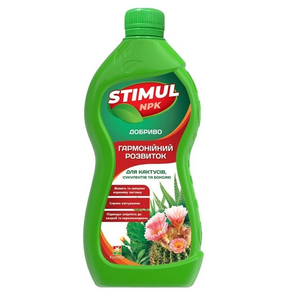 Добриво Стимул для кактусів та сукулентів застосовується для наступних рослин: Лобівія, ехінопсис, ферокактус, опунція, пародія, ореоцереус, ребюція, трихоцеріус, агава, алое, товстунка, ечеверія, гастерія, хавортіонік, драм, мам • Мінеральне добриво «Стимул» для кактусів та сукулентів це: • Комплексне, збалансоване калій-азотно-фосфорне добриво, що містить мікроелементи. • Забезпечує повноцінне харчування та розвиток рослин. • Добриво для кактусів підвищує стійкість до хвороб. Добриво застосовується для кореневої підгодівлі (полив 1-2 рази на місяць), позакореневої підживлення.