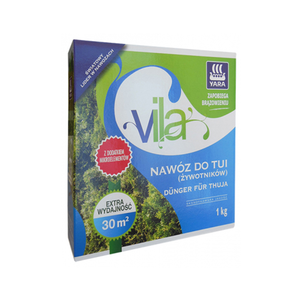Добрива для туй Yara Vila 1 кг - спеціальне добриво для догляду за всіма типами туй. Ретельно підібрані інгредієнти та додавання живильних мікроелементів забезпечити рослинам пишне та густе зростання. Добриво впливає на інтенсивний зелений колір, зменшуючи ризик потемніння. Регулярне використання підвищує стійкість рослин до хвороб та морозу. Простота у використанні - не вимагає ніяких спеціальних обробок для змішування з ґрунтом. Застосування: Використовуйте кожні 2 місяці, два-три рази протягом сезону з ранньої весни (березень) до кінця липня. Посипати добрива рівномірно довкола туї, а потім ретельно полити водою. Молоді посадки удобрюють лише за кілька місяців після посадки. Дозування: Молоді насадження: 30-40 г/м2 (1 рослина) Старі насадження: 40-50 г/м2 (1 рослина) Під час останнього внесення – дозування слід зменшити вдвічі.